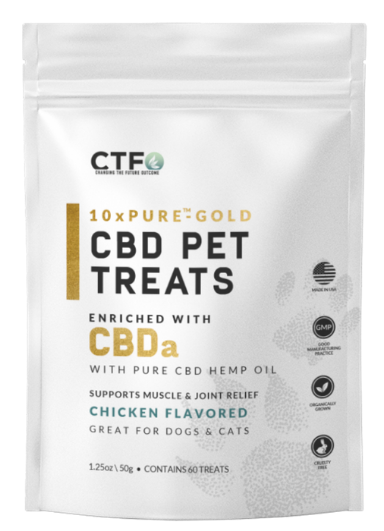A convenient, delicious & playful way to make this a part of your pet’s diet. CTFO delivers the future of CBD botanical science…today. Our patented 10xPURE™ oil process enriched with CBDa has been shown in studies to be far more effective than CBD in reducing discomfort and providing relief. Our 10xPURE™ Chicken flavored Pet Treats can help reduce stress and anxiety while keeping your pet feeling and acting youthful. Pets less than 15 lbs. get 2 treats, over 15 lbs. get 4 treats.
